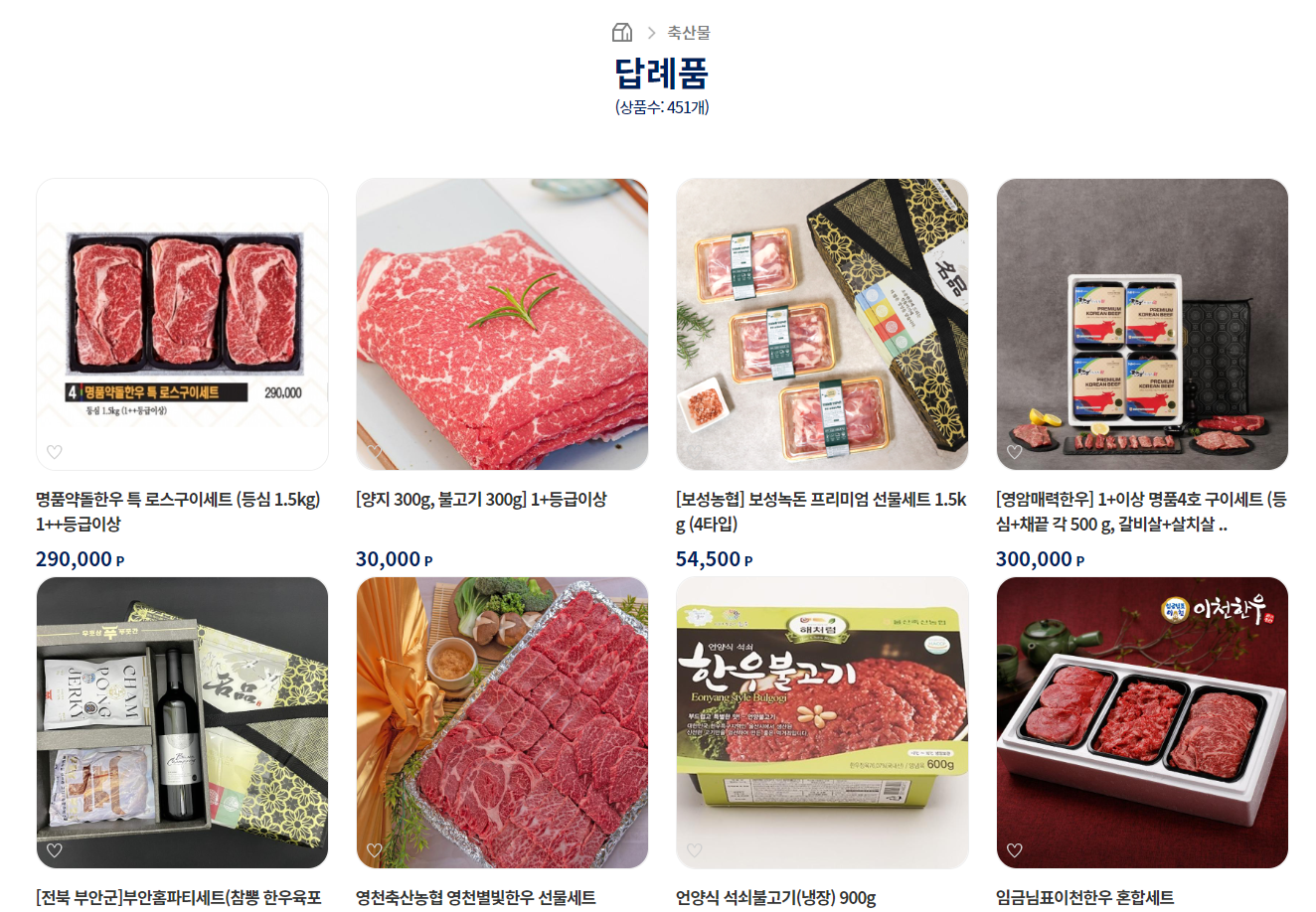 답례품으로는 축산물, 상품권등 다양하게 준비되어있어요.